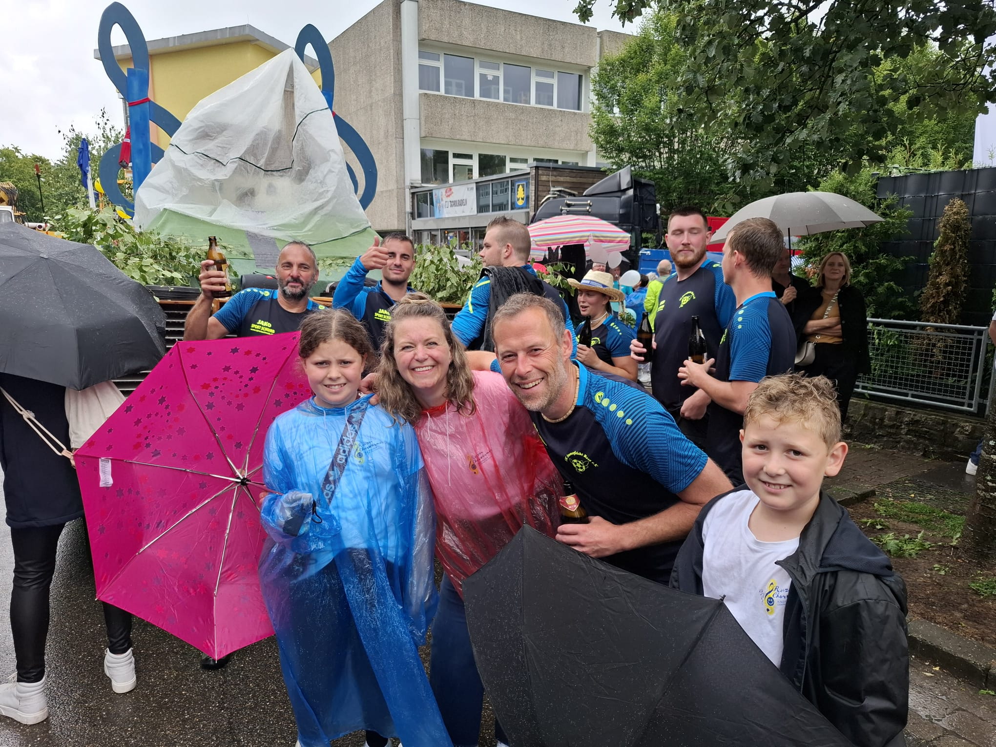 Zum Abschluss des Festumzugs gab es ein gemeinsames Gruppenfoto mit vielen nassen, aber glücklichen Gesichtern.
